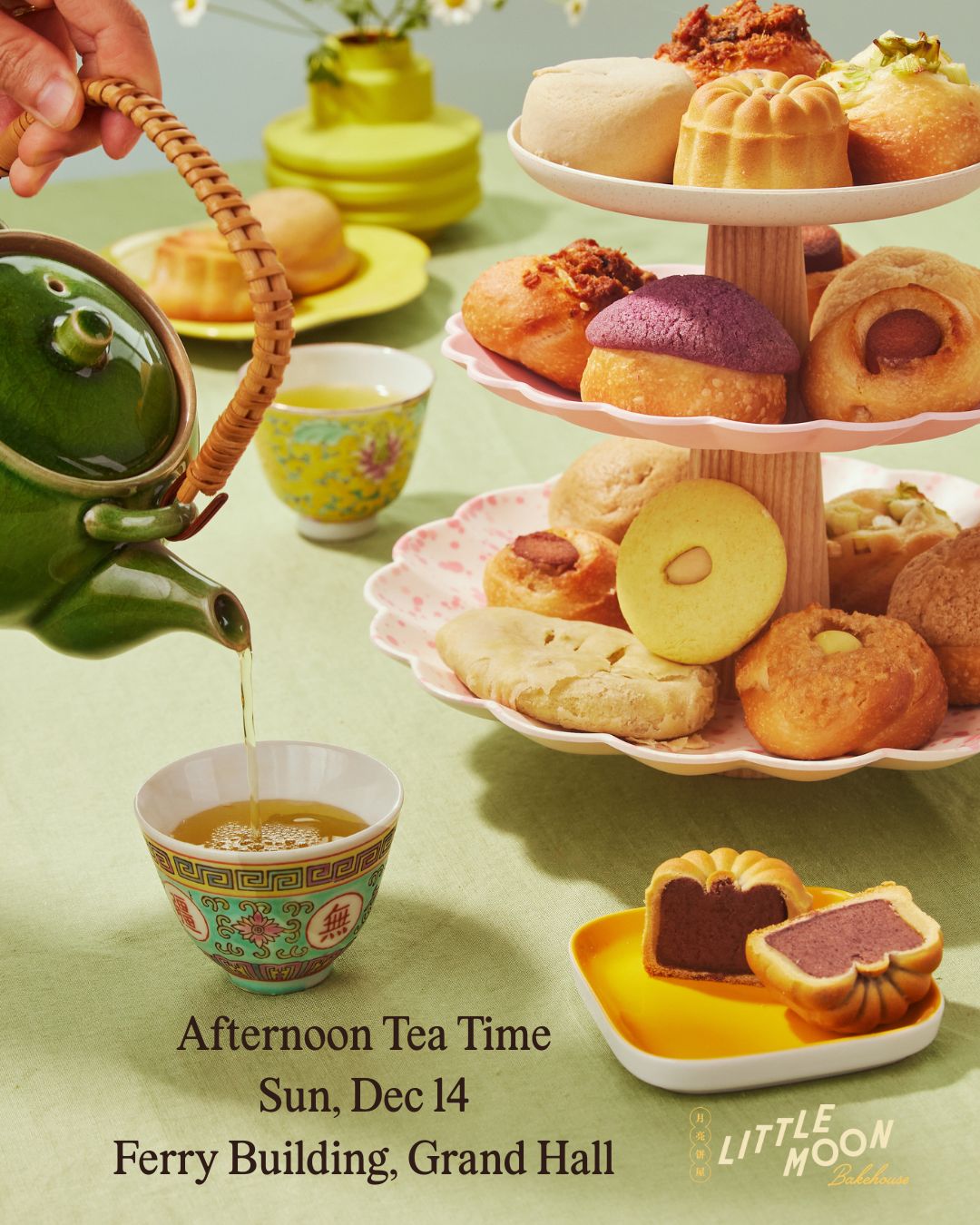 On Sun, Dec 14 Little Moon Bakehouse is hosting our largest Afternoon Tea Time yet! Join us for one seating at the SF Ferry Building's Grand Hall. Tea partner to be announced.Â